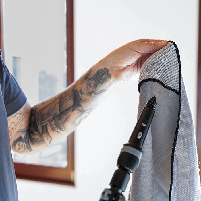 Grâce à son cône composée de caoutchouc, elle est idéale pour sécher les coins des fenêtres à l'aide de microfibre.